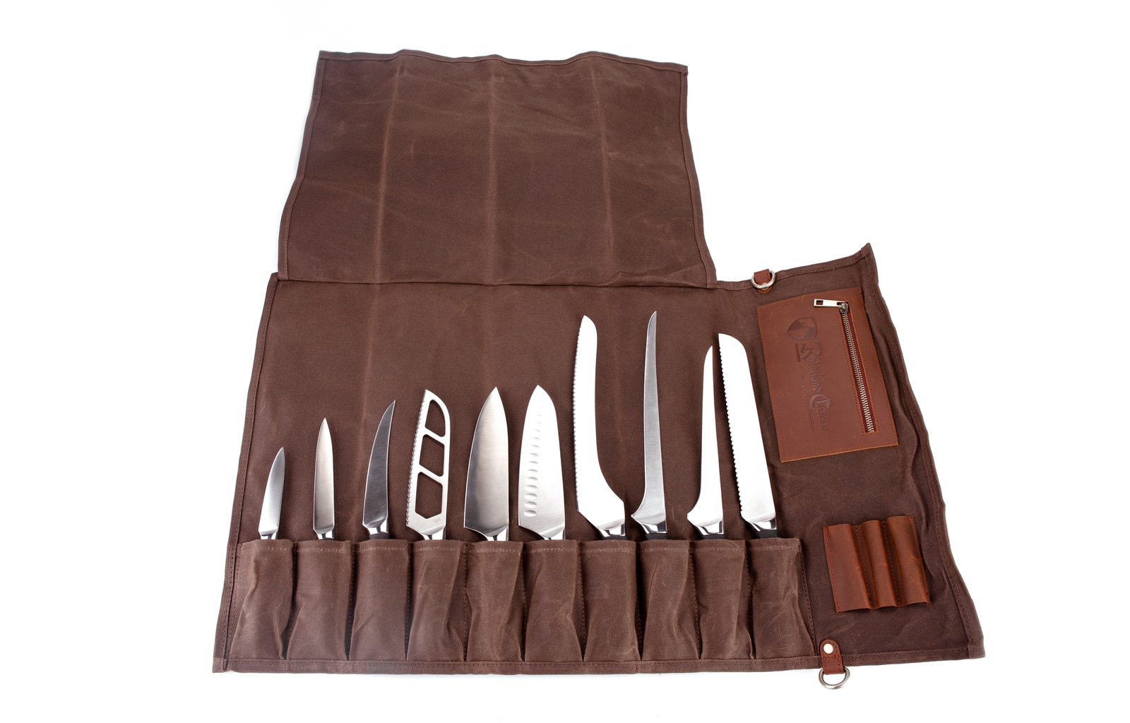Rustic and hearty, it wears even better with time. Ten individual knife slots in addition to zipped storage pocket and secured loop fasteners. Top fold-over flap keep knives extra secure. Adjustable shoulder strap.