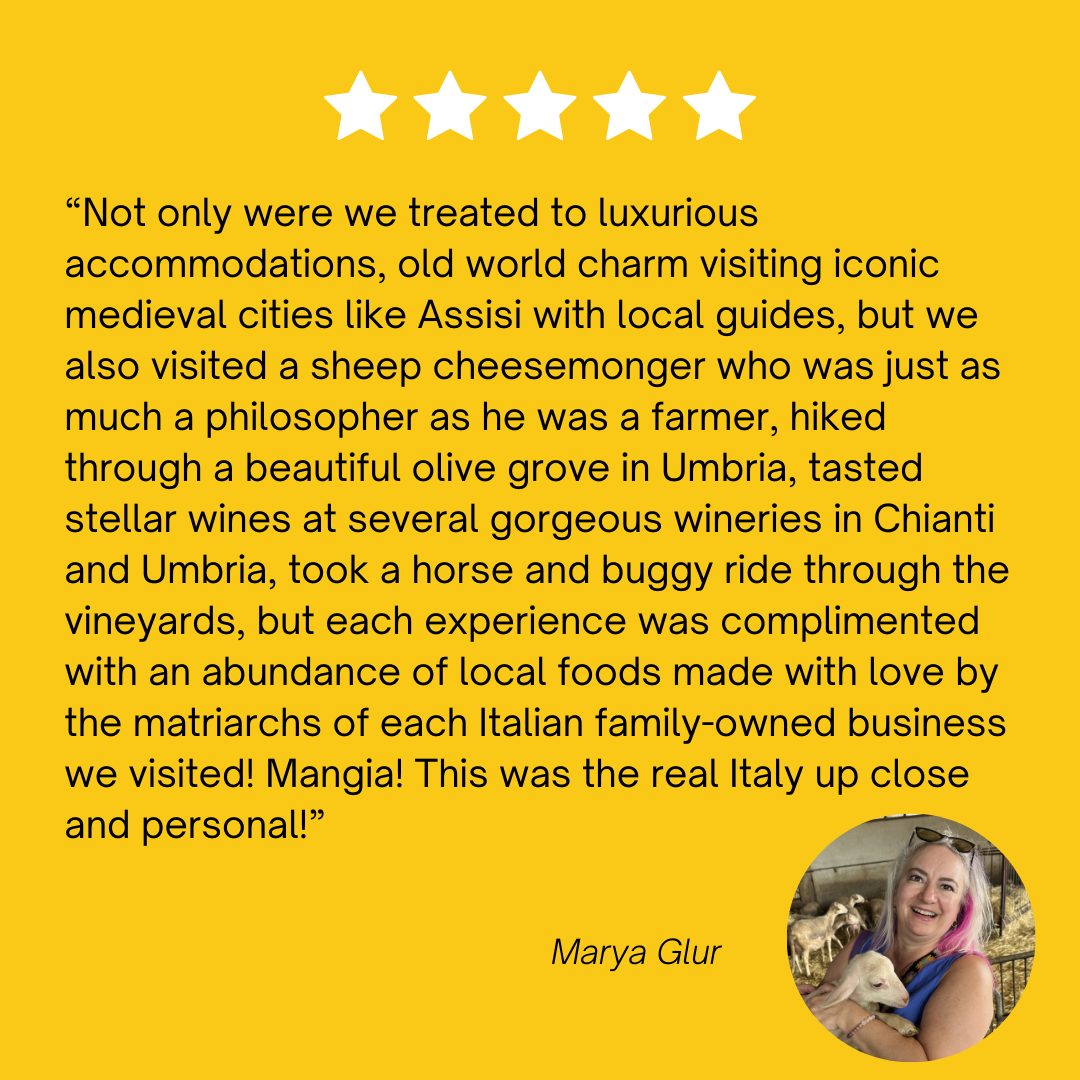 Experience the trip of a lifetime with us—a hand-curated 10-day/9-night journey that captures the essence of Italy’s beauty, culture, and culinary delights. Your adventure begins at a traditional Italian farmhouse villa, by our host Patrizia, where the heart and soul of hospitality come alive. You’ll be welcomed like family. From savoring authentic Italian dishes to participating in hands-on cooking experiences with a private chef, the Patrizia’s warmth and passion will make you feel immersed in the heart of Italian tradition.